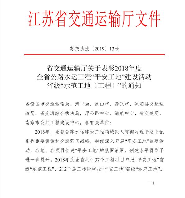 南通港呂四港區(qū)進港航道工程 榮獲“2018年度江蘇省級平安示范工地”榮譽稱號