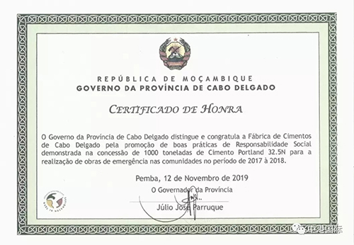 On November 28, 2019, signed by the governor of the Delgado Province, the honorary certificate was issued to Delgado Cement Plant by the head of the Bureau of Industry and Commerce to express the gratitude from Mozambican government for Delgado Cement Plant’s long-term support to the development of social welfare and public utilities.