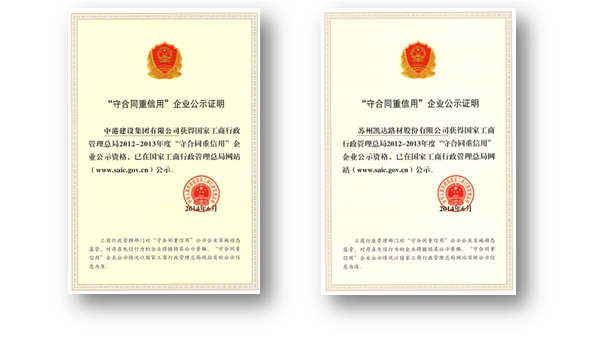 2014年6月,經(jīng)國家工商行政管理總局對全國所有在冊企業(yè)進(jìn)行考評,中港建設(shè)集團(tuán)有限公司及下屬公司蘇州凱達(dá)路材股份有限公司雙雙被國家工商總局認(rèn)定為2012-2013年度“守合同重信用”企業(yè)稱號。近期,中港建設(shè)集團(tuán)有限公司及下屬公司蘇州凱達(dá)路材股份有限公司收到國家工商行政管理總局“守合同重信用”企業(yè)榮譽證書。